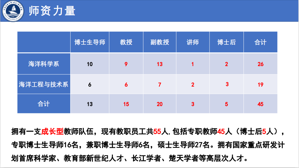 w66利来旗舰厅始源于20世纪50年代公司组建的海洋地球物理勘探教研室,成立于2016年,现有海洋科学湖北省重点学科1个,海洋科学博士后科研流动站1个,海洋科学一级学科博士学位授予权1个,海洋科学一级学科硕士学位授予权1个,地质工程专业学位授予权1个,拥有“本科-硕士-博士”完整人才培养体系。公司现有教职工55人,其中教授15人、副教授22人、讲师3人,拥有国家重点研发计划首席科学家等高层次人才。