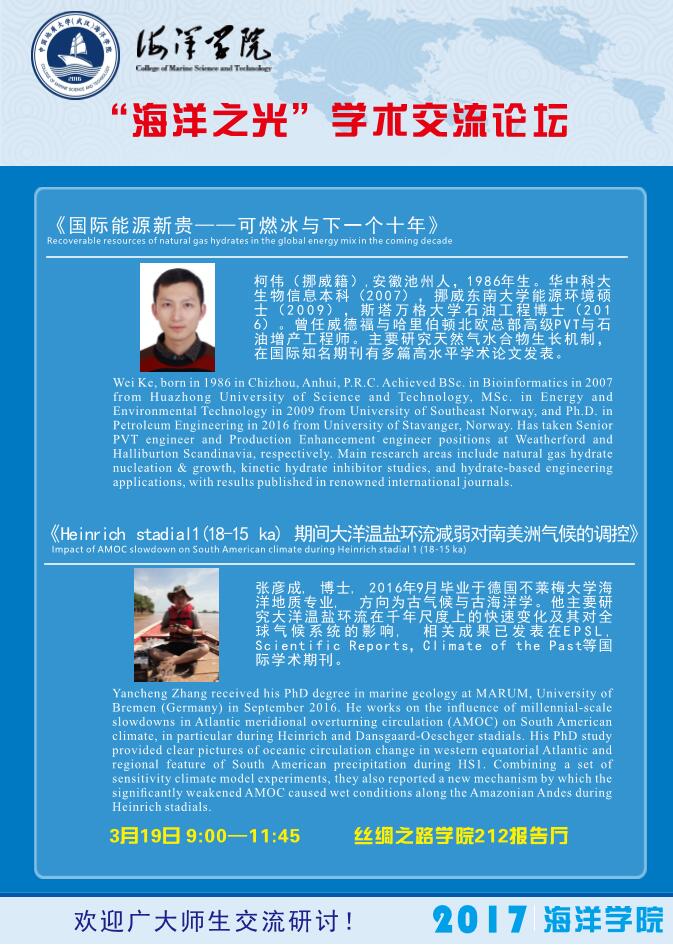 张彦成, 博士, 2016年9月毕业于德国不莱梅大学海洋地质专业, 方向为古气候与古海洋学。他主要研究大洋温盐环流在千年尺度上的快速变化及其对全球气候系统的影响, 相关成果已发表在EPSL, Scientific Reports,Climate of the Past等国际学术期刊。Yancheng Zhang received his PhD degree in marine geology at MARUM, University of Bremen (Germany) in September 2016. He works on the influence of millennial-scale slowdowns in Atlantic meridional overturning circulation (AMOC) on South American climate, in particular during Heinrich and Dansgaard-Oeschgerstadials. His PhD study provided clear pictures of oceanic circulation change in western equatorial Atlantic and regional feature of South American precipitation during HS1. Combining a set of sensitivity climate model experiments, they also reported a new mechanism by which the significantly weakened AMOC caused wet conditions along the Amazonian Andes during Heinrich stadials.
