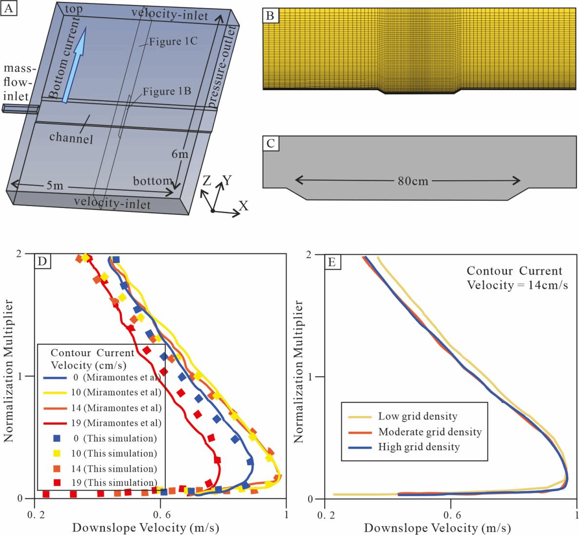 1. (A)模型示意图。(B)数值模拟中的网格截面。(C)模型中应用的水道截面。(D)Miramontes 等人(2020)的水槽实验模型验证。(E)网格无关性分析。(BC)的截面位置均标注于(A)中。