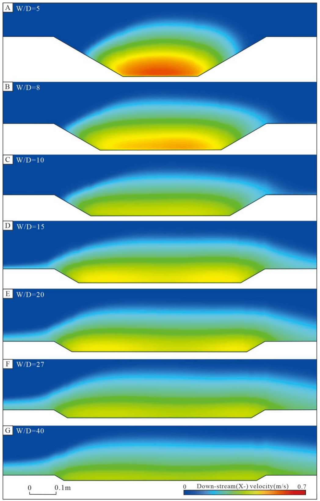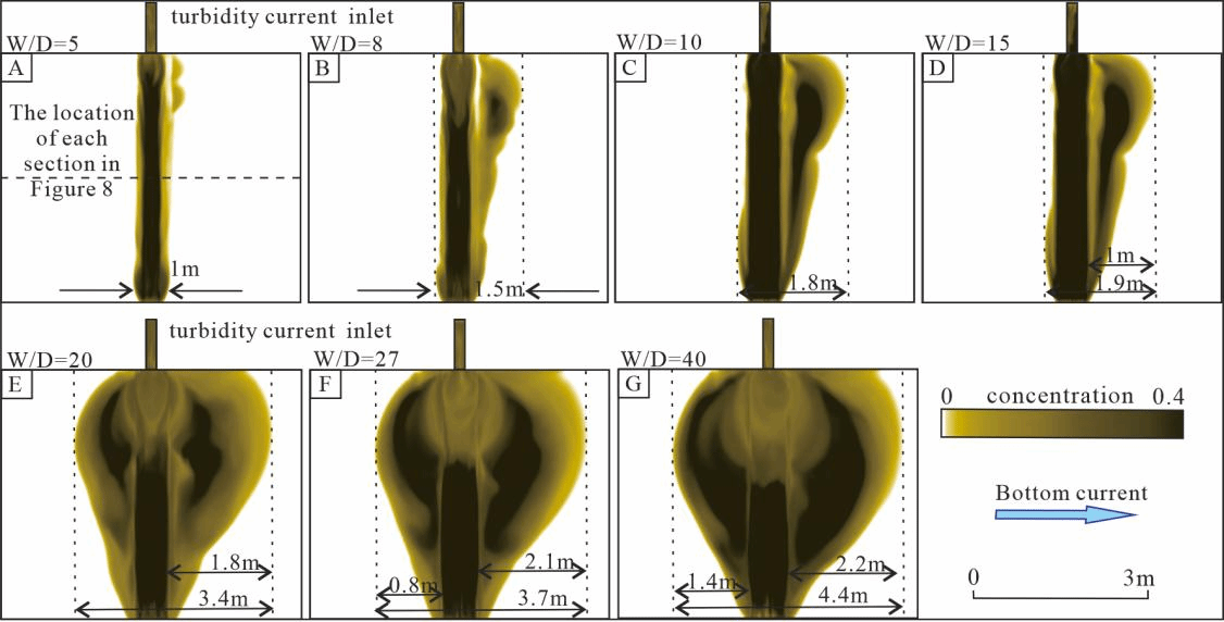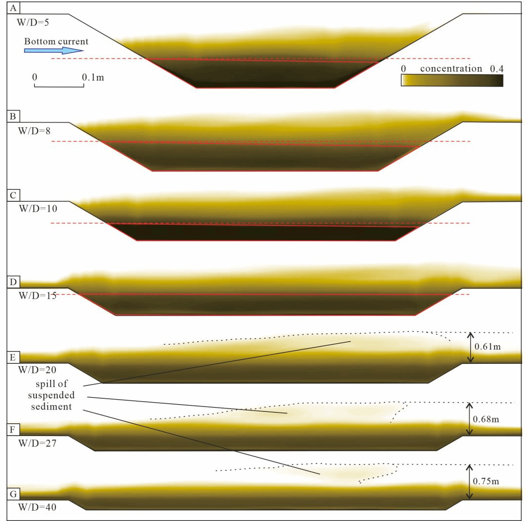 针对上述问题,研究基于对前人地震资料的分析和数值模拟手段,构建了一系列具有不同宽深比的水道模型,依托Fluent数值模拟平台,采用基于有限体积法的欧拉多相流模型,求解海水沉积物颗粒的质量与动量守恒方程,系统分析重力流底流交互背景下流体沉积耦合行为通过比较不同宽深比条件下水道内的流体结构特征,从流体动力学角度深入探讨重力流与底流共同控制下不同限制性水道的迁移机制