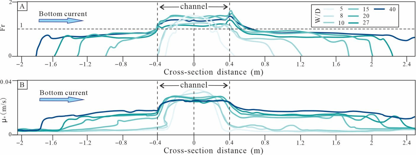2. (A) Froude数与 (B) 湍流剪切速度沿道横截面的分布,其中0 m代表通道中心