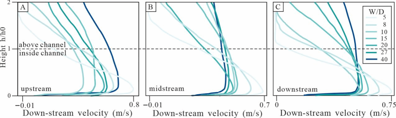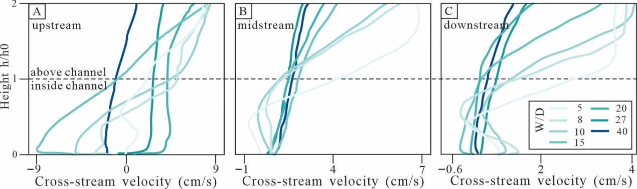 4. (A)上游、(B)中游及(C)下游沿道轴线的重力流方向流速分布。由于模拟案例具有不同的水道深度,故对深度进行归一化处理,以便在不同宽深比条件下进行跨案例比较