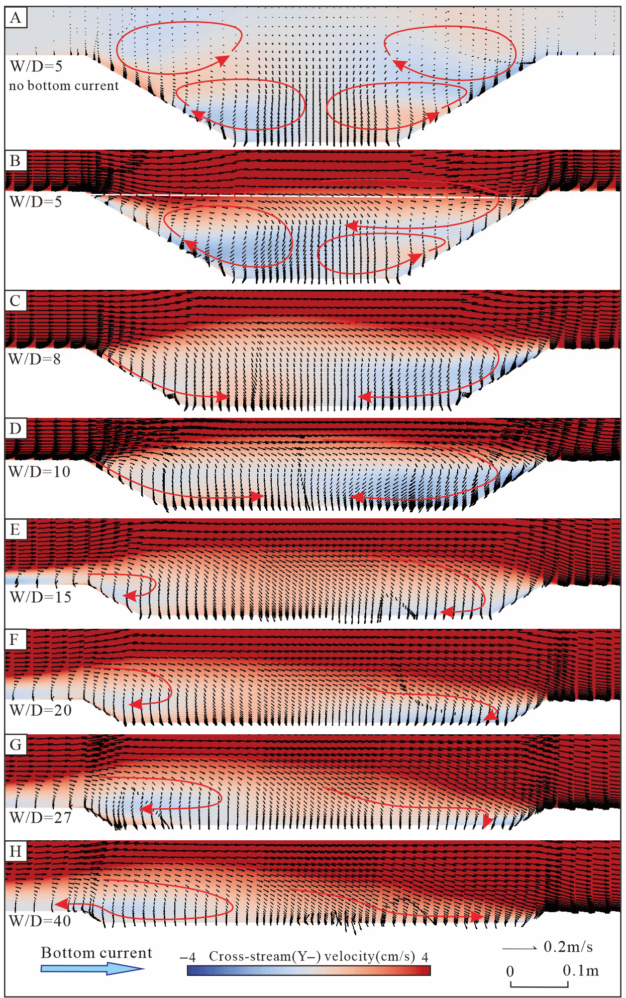 研究结果表明,水道限制性的变化调控着重力流与底流交互作用强度,进而改变水道内流速分布和二次流环流结构,最终影响近床底沉积物的动力学响应。随着宽深比增加,交互作用增强,水道内二次流位置由顺底流一侧移至逆底流一侧,相应地,近床底沉积物的优势输运方向亦由向底流上游偏移转变为向底流下游偏移。①对于极强限制性水道底流影响主要位于水道上方,重力流则基本限制在水道内部,两者交互作用极弱。水道内流体行为与无底流时的重力流类似,受湍流各向异性主导的二次流控制,因此水道基本不发生侧向迁移。②对于中等限制性水道此类水道具有较小宽深比,但底流已能对重力流产生显著影响。交互作用下在水道下游形成由底流重力流剪切压力差驱动的二次环流,将下游近床底沉积物输运至上游堆积,促使水道整体向下游迁移。③对于较弱限制性水道宽深比较大,重力流底流交互作用较强。底流翻越水道壁后直接下沉,将沉积物输移至下游堆积,而上游形成的二次环流极弱。该机制导致水道倾向于向上游迁移。