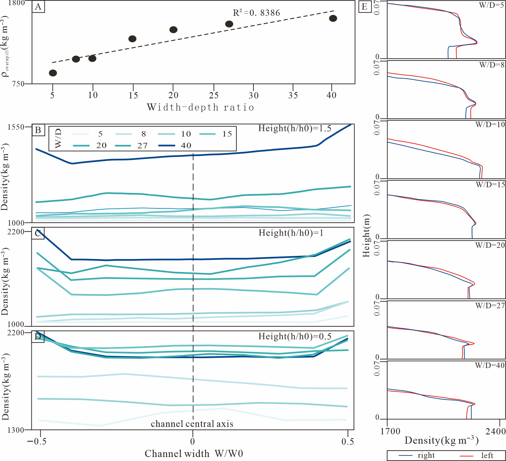 9. (A) 流体平均溢流密度随宽深比增大而增加。(B–D道内流体密度的横分布,分别对应深度的1.5倍、1倍和0.5倍高度。宽深比较大的道表现出更高的溢流高度。(E) 不同宽深比下道两侧流体密度对比。随着宽深比增大,近床层密度分布从左侧较高(红线)向右侧偏移至较高(蓝线)。