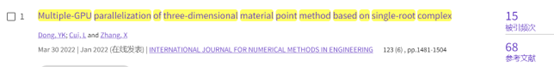 该论文题为“Multiple-GPU parallelization of three-dimensional material point method based on single-root complex”,发表于《International Journal for Numerical Methods in Engineering》2022年第123卷第6期(页码:1481-1504:DOI: 10.1002/nme.6906)。《International Journal for Numerical Methods in Engineering》由美国John Wiley & Sons出版公司出版,英国发行,是集中发表有限元方法的重要期刊。