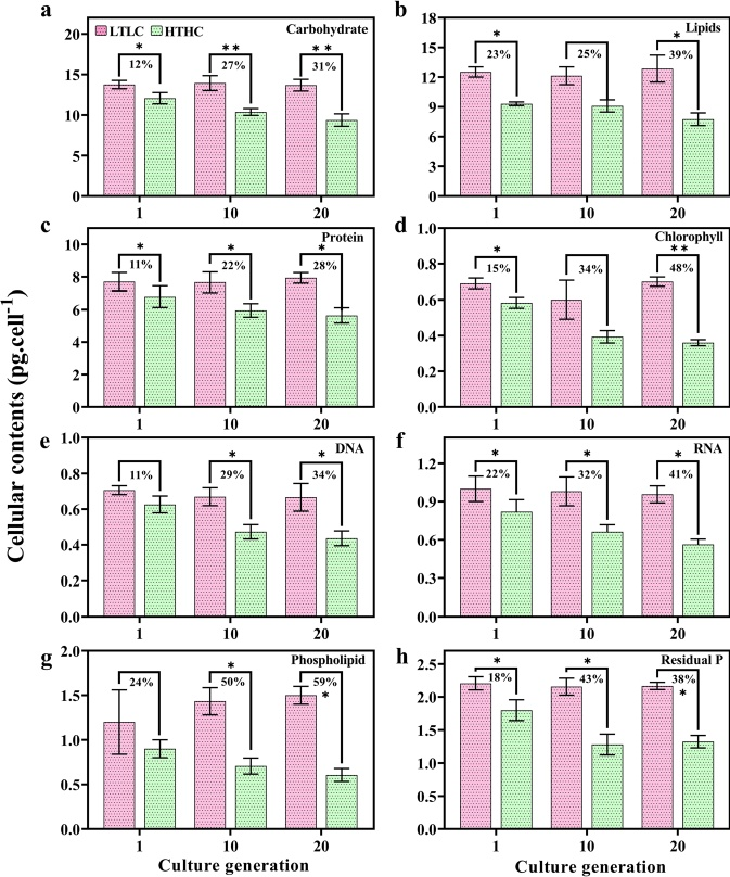 图2在LTLC和HTHC条件下,不同代赤藻的宏观(碳水化合物、脂质和蛋白质)和次要(叶绿素、DNA、RNA、磷脂和残磷)分子含量的变化。