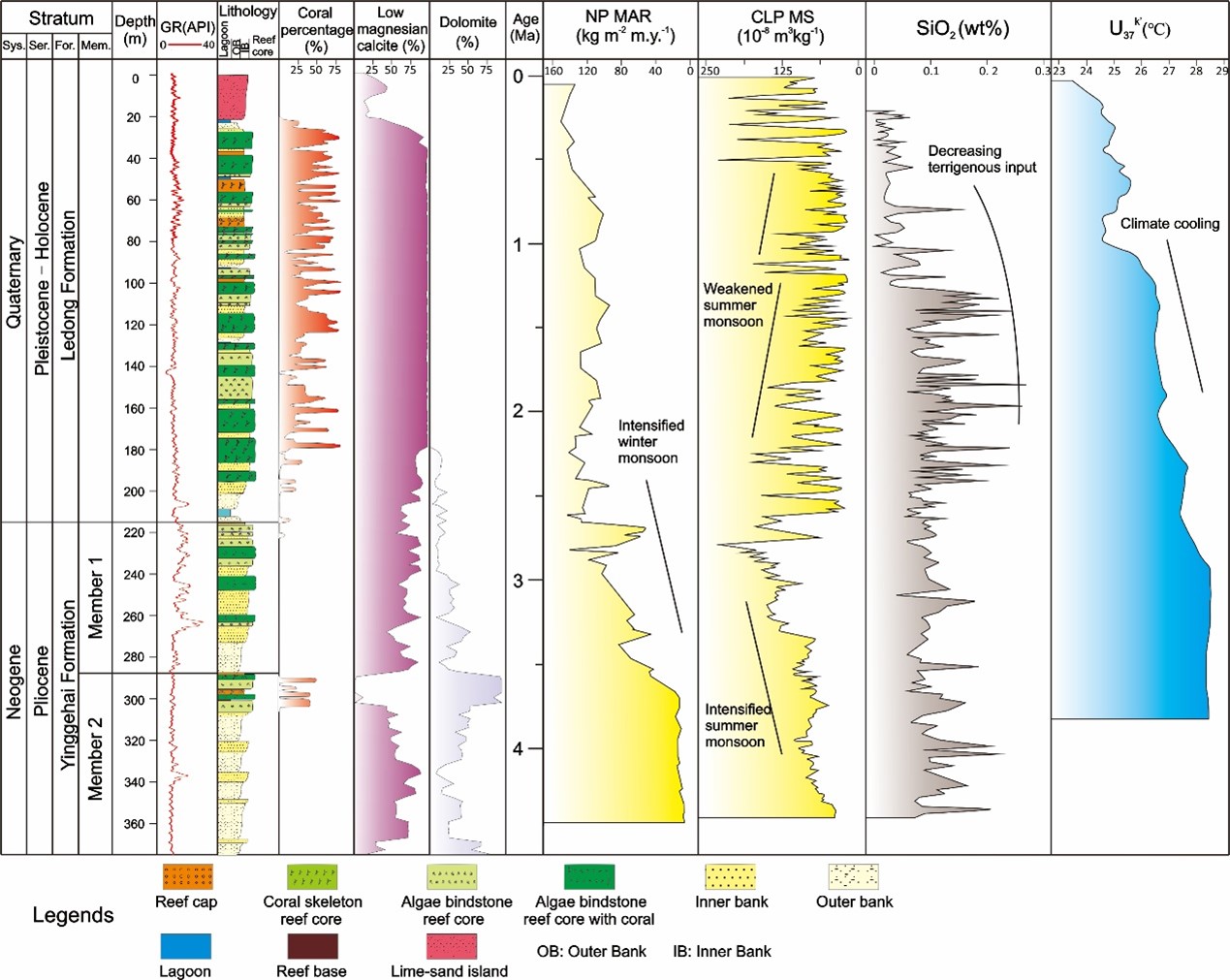 本研究通过对各项气候参数指标和陆源指标的汇总发现生物礁发育的背景处于强冬季风、若夏季风、弱陆源输入和气候变冷的背景环境中(图1)。同时针对珊瑚礁控制因素的研究进一步发现珊瑚礁的生长期次与海平面的升降一致,通过噪声变化模拟出的相对海平面升降以及天文年代格架建立的沉积速率变化可将上新世到全新世生物礁的发育划分出三个主要阶段,整体上随海平面上升沉积速率变高,发育阶段与生物礁岩相的变化一致,海平面到最大时岩相表现为泻湖沉积(图2)。