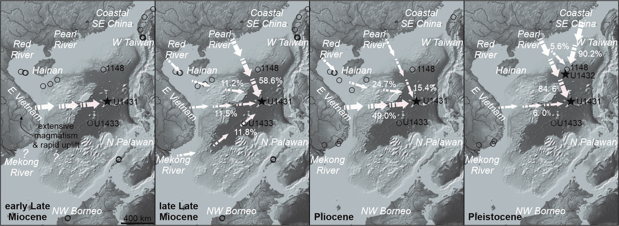 图3 南海地区晚中新世-更新世源汇系统恢复示意图 |