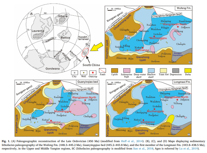 A comparison of the volcanic ash beds in three different outcrops of SC during the OST; indicates that relatively large-scale volcanic activity occurred during this period. The newly obtained zircon U–Pb ages show that the starting time of the Ordovician Wufeng Fm. was approximately 449.2 Ma (or 449.3 Ma), the starting time of the Ordovician Guanyingqiao bed (the ending time of the Wufeng Fm.) was approximately 445.6 Ma, and the starting time of the Longmaxi Fm. was approximately 444.2 Ma. In addition, the durations of the Wufeng Fm. and Guanyingqiao bed were 3.6 Ma and 1.4 Ma, respectively, and the duration of the Hirnantian stage in SC was 1.4 Ma. Most of the ages obtained in this study were basically consistent with that of the International Commission on Stratigraphy (GST 2018). These results provide insights into the volcanic activity during the OST in SC as well as age data for a global stratigraphic framework.