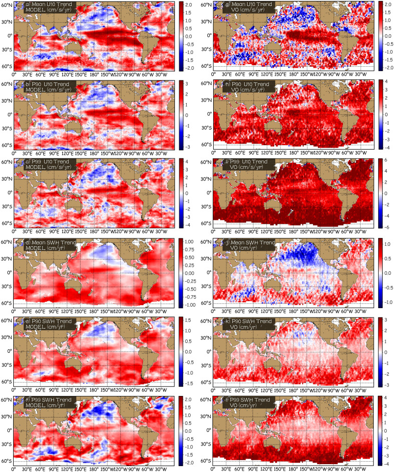 Fig. 6. Global trends of U10 (upper half) and SWH (lower half) statistics from ERA5 (left a-f) and ERA5 2° × 2° VO (right g-l) over the period 1985–2018, obtained using monthly mean values (1st and 4th rows), monthly 90th percentiles (2nd and 5th rows), and monthly 99th percentiles (3rd and 6th rows). It is noted that the colour scales for different subplots are different. (For interpretation of the references to colour in this figure legend, the reader is referred to the web version of this article.)