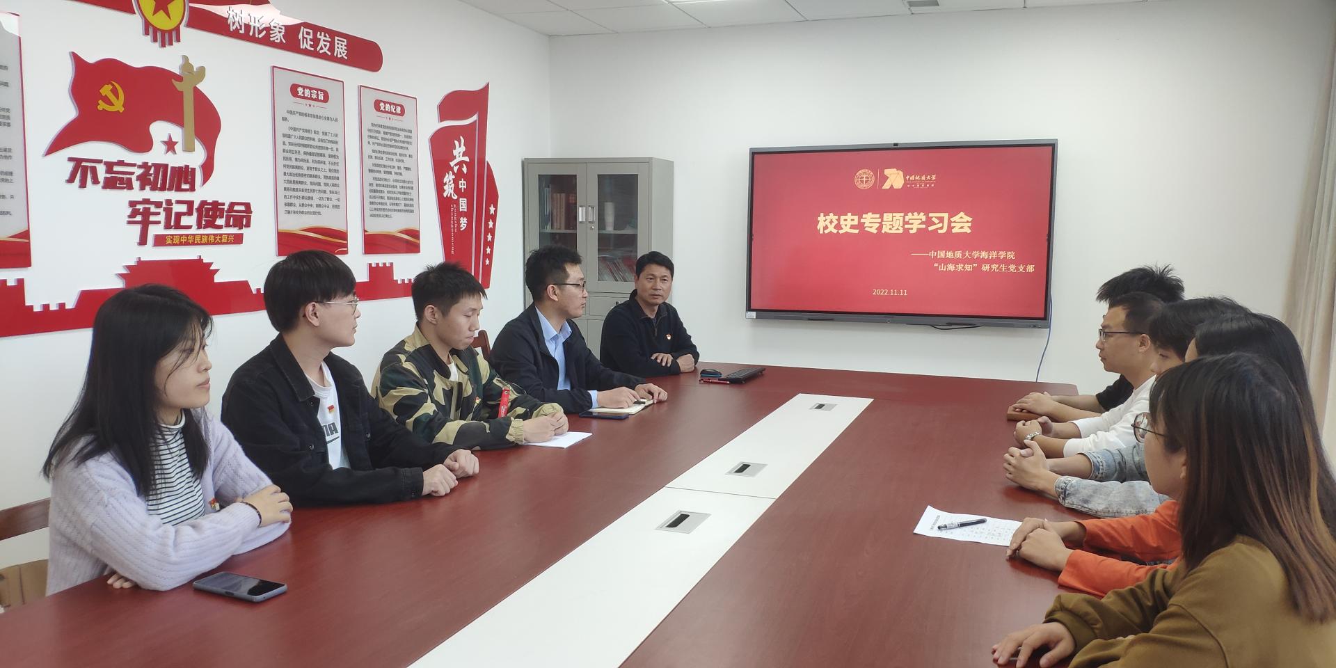 当天下午,“山海求知”研究生党支部举行校史专题学习会。党支部书记陈刚教授为党支部成员讲述了w66旗舰厅官网从北京建校到校区南迁70年的历史,介绍了w66旗舰厅官网(武汉)与w66旗舰厅官网(北京)的历史关系,赞美了高元贵、李四光、何长工、刘型四位建校元勋,带领同志们回忆了地大的红色血脉和难忘的校园岁月。