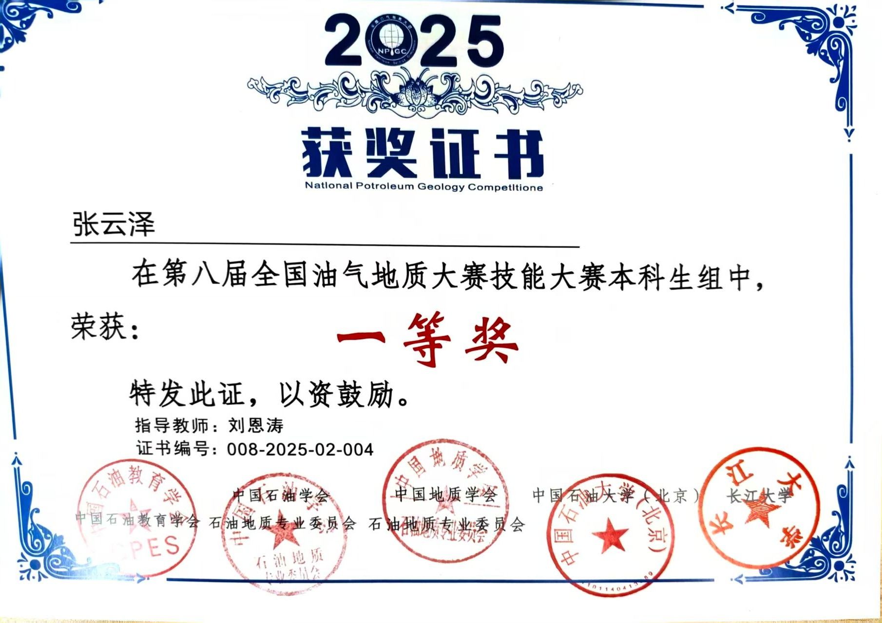 在科研领域,张云泽从不甘落后。他作为主要成员参与两项国家级老员工创新创业训练计划项目并成功结题,将课堂所学转化为实践成果;竞赛中,他斩获全国油气地质大赛一等奖、全国智慧海洋大数据应用创新大赛优胜奖等荣誉,用实力证明了科研能力。这些探索不仅提升了他的专业素养,更培养了团队协作与解决问题能力。
