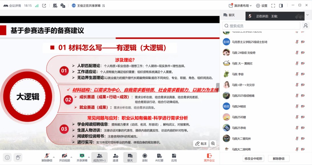 11月14日晚,w66利来旗舰厅、李四光公司、马克思主义公司、教育研究院四院联合举办“职业生涯规划大赛”线上培训。王俊老师为参赛同学讲解职业规划材料如何撰写以及答辩注意事项。线上共吸引了300余名员工参加培训,老师的精彩讲解收获了广大师生的一致好评。