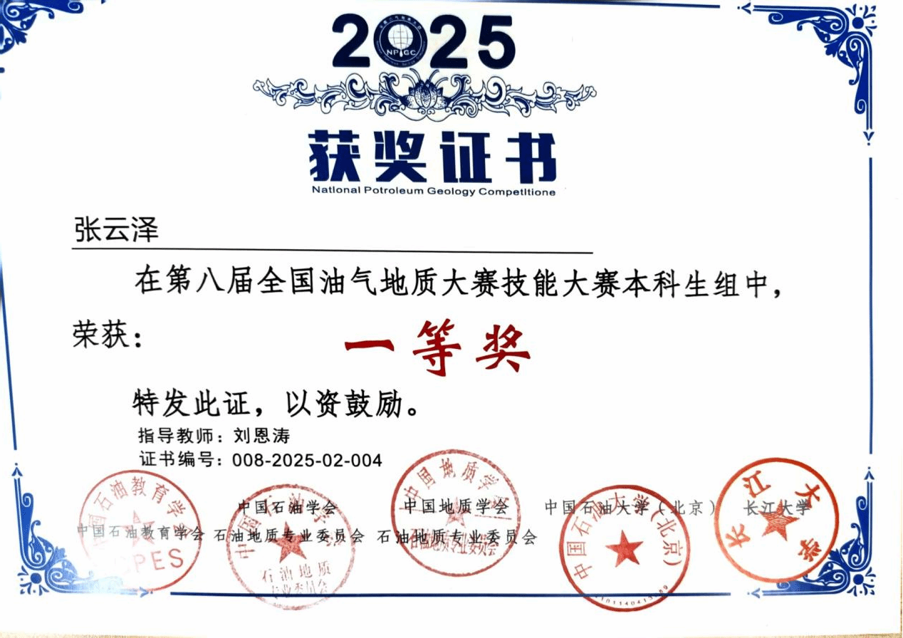 在科研领域,张云泽从不甘落后。他作为主要成员参与两项国家级老员工创新创业训练计划项目并成功结题,将课堂所学转化为实践成果;竞赛中,他斩获全国油气地质大赛一等奖、全国智慧海洋大数据应用创新大赛优胜奖等荣誉,用实力证明了科研能力。这些探索不仅提升了他的专业素养,更培养了他团队协作与解决问题的能力。
