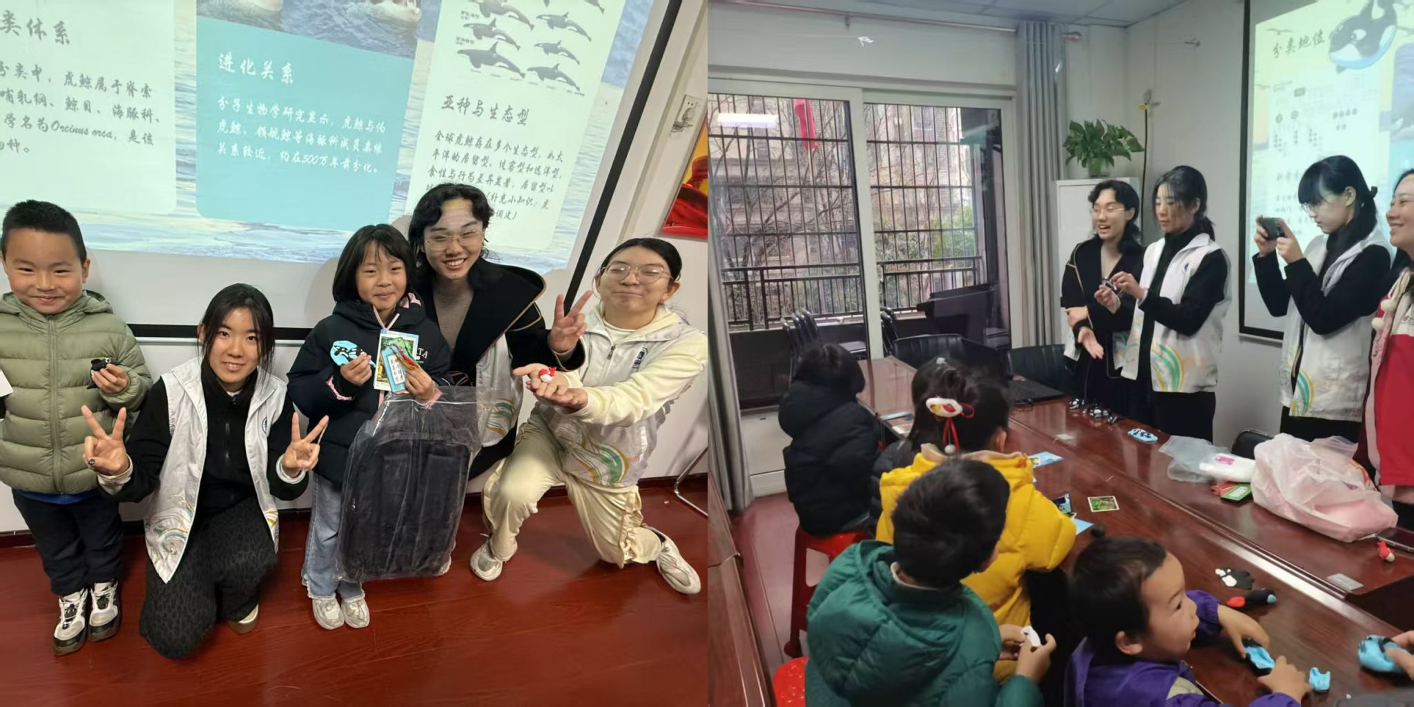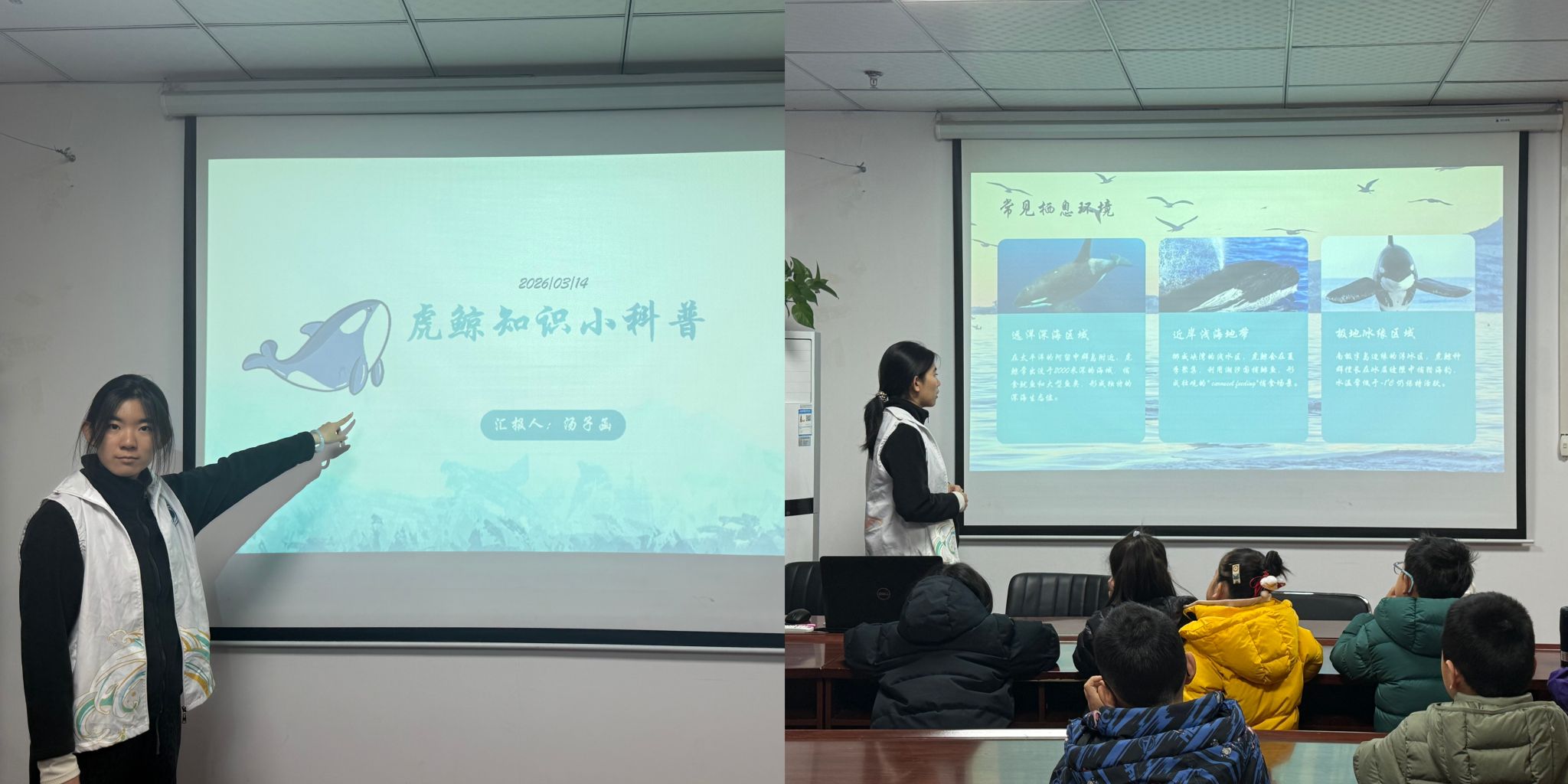 活动现场,志愿者汤子函化身 “海洋科普讲解员”,围绕海洋生物虎鲸的生活习性、分布范围等内容,用通俗易懂的语言、生动鲜活的案例,揭开虎鲸的神秘面纱。中间插入与保护虎鲸相关的问题,激发小朋友的对海洋生物保护的思考。