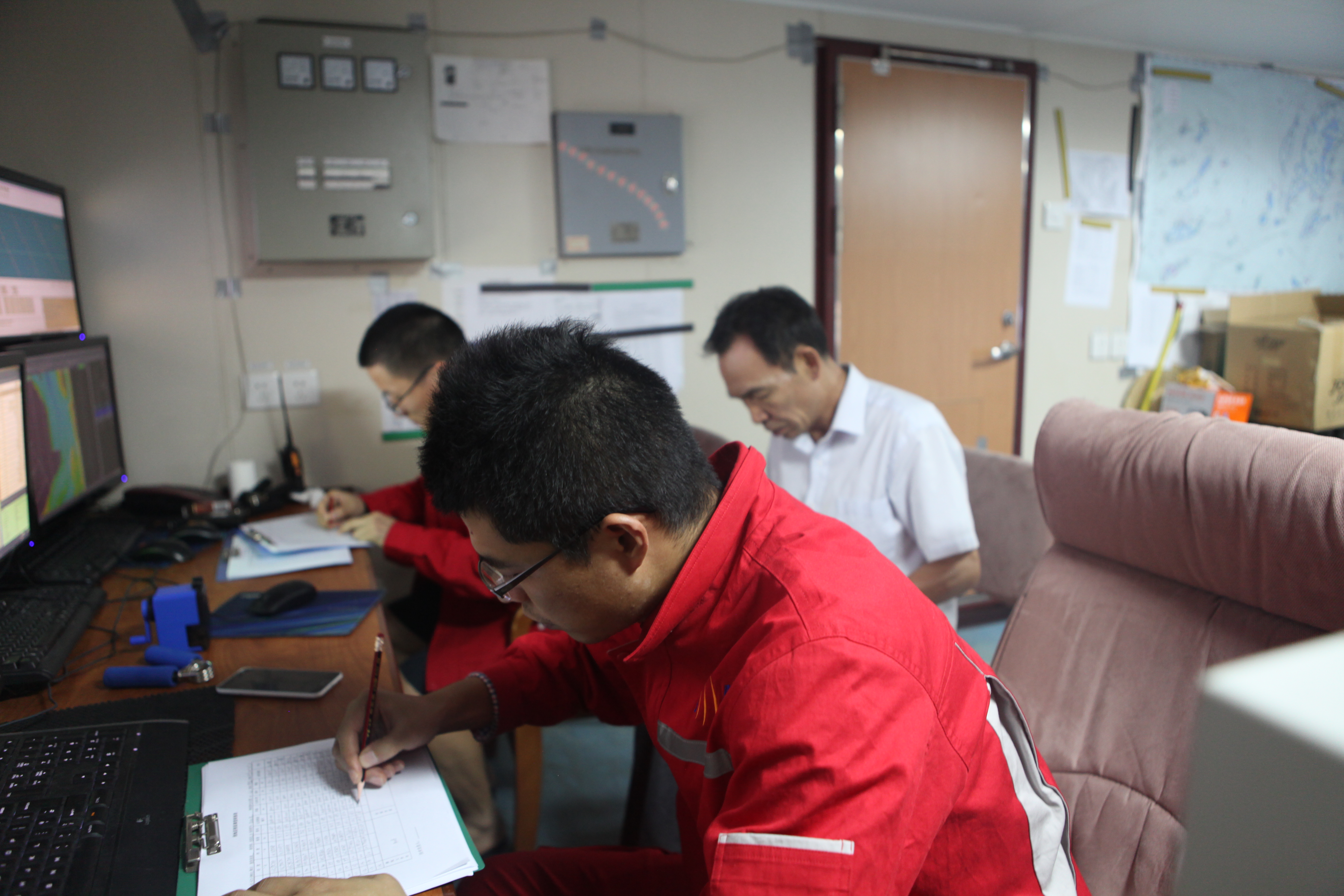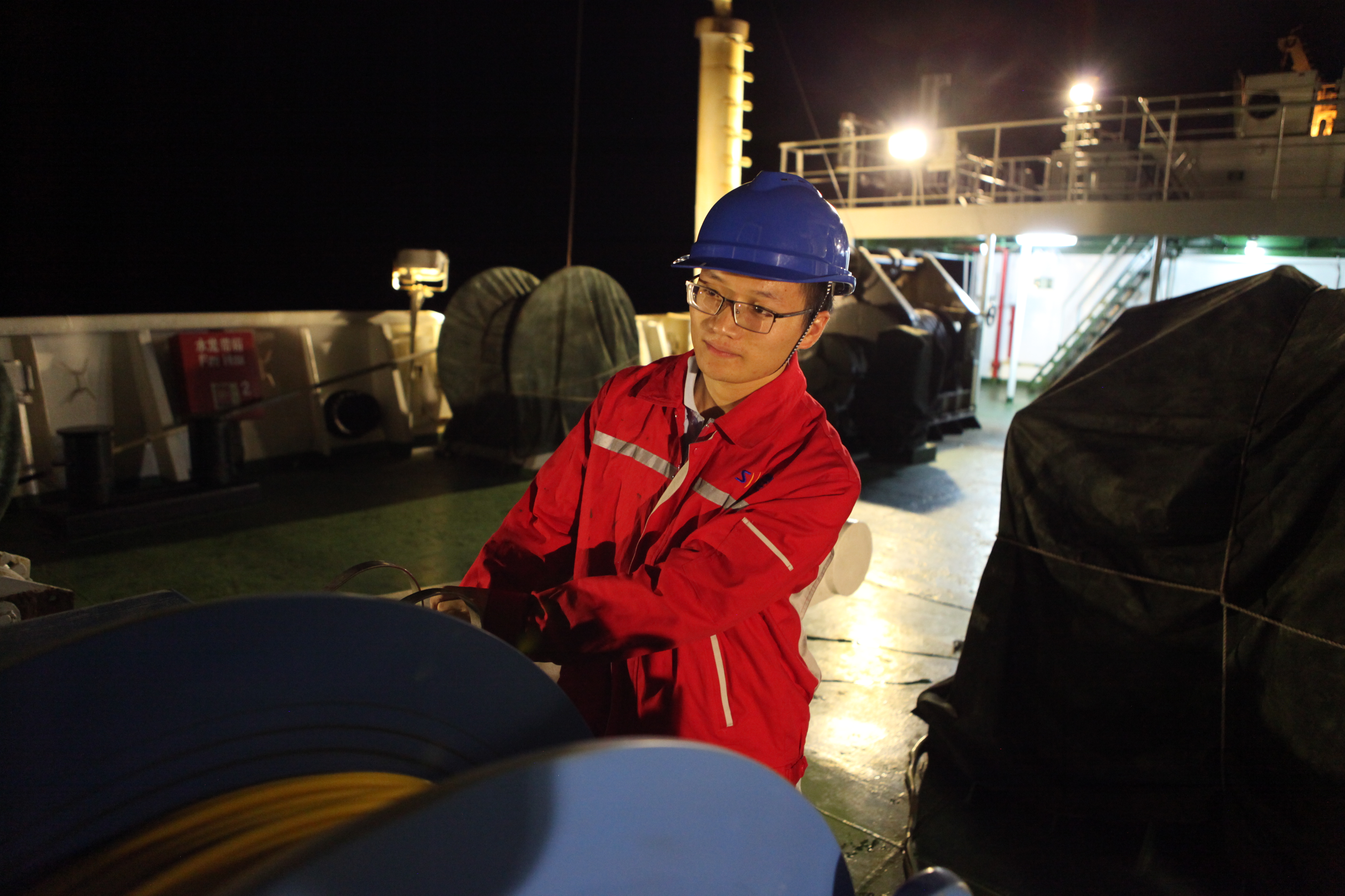 由于我们的任务时间比较紧张,所以我们船是24小时在不停的工作,我每天是晚上九点到凌晨两点值班,这使得我改变自己在公司的作息时间。第一天还真是不太适应,值班时就有点打瞌睡,后来经过慢慢的调整,我也适应了这种工作。值班的时候主要观察仪器是否有故障,另外我们每半小时需要记录一组原始数据,因此工作还是很轻松的。