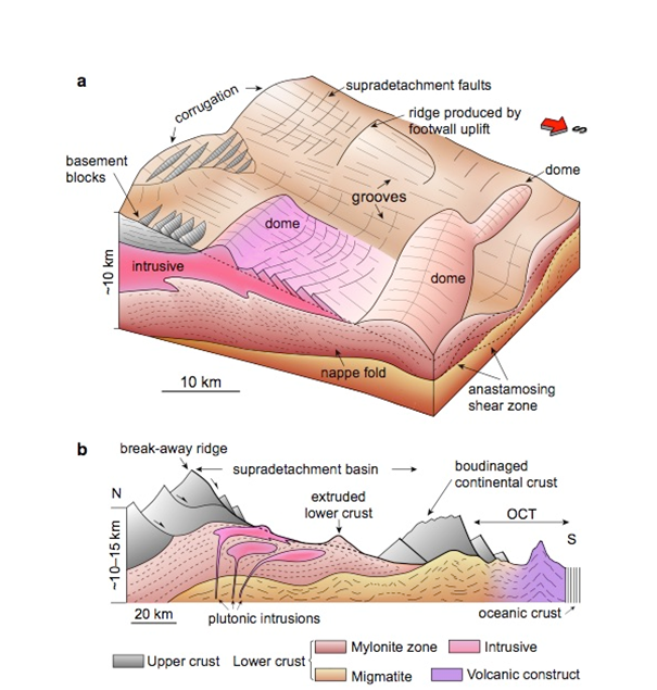 大陆裂谷记录了地球演化的脉动,根据地壳岩石圈热-力学性质的不同可形成宽或窄的裂谷带。窄裂谷带宽约 100 公里,如著名的东非大裂谷;宽裂谷带则可达 1000 km, 如著名的美国西部科迪勒拉山发育的盆岭省,其长逾 1500 km 宽超过 1000 km。我国南海被动陆缘保存了典型的宽裂谷带特征,其南、北部边缘分别达到了 1000 km 和 500 km 宽。近年来的大洋钻探计划(IODP)没有发现大西洋型的地幔剥露,进一步显示南海的演化可能与大西洋型被动陆缘不同。结合高清的地震数据和典型构造变形的对比,本文详细记录了位移量超过 100 km 的大型拆离断层,变质核杂岩,以及地壳尺度的韧性折叠层和岩浆侵入体,根据这些变形特征与典型宽裂谷作用下的构造变形对 比,我们提出南海的裂谷作用发生在较高的地温条件下,早期曾经历了跟美国西部盆岭省和爱琴海的宽裂谷作用变形极为相似的过程,但是最终发生了岩石圈裂解。