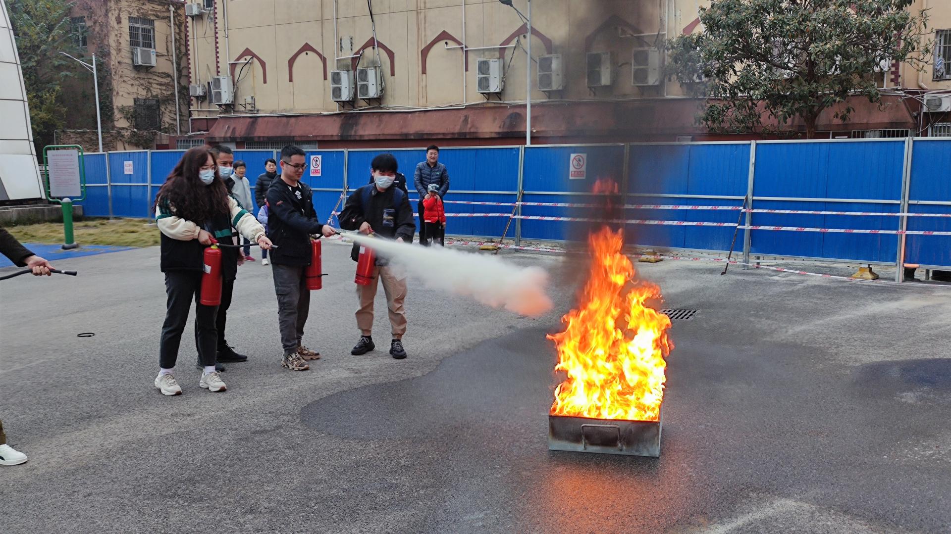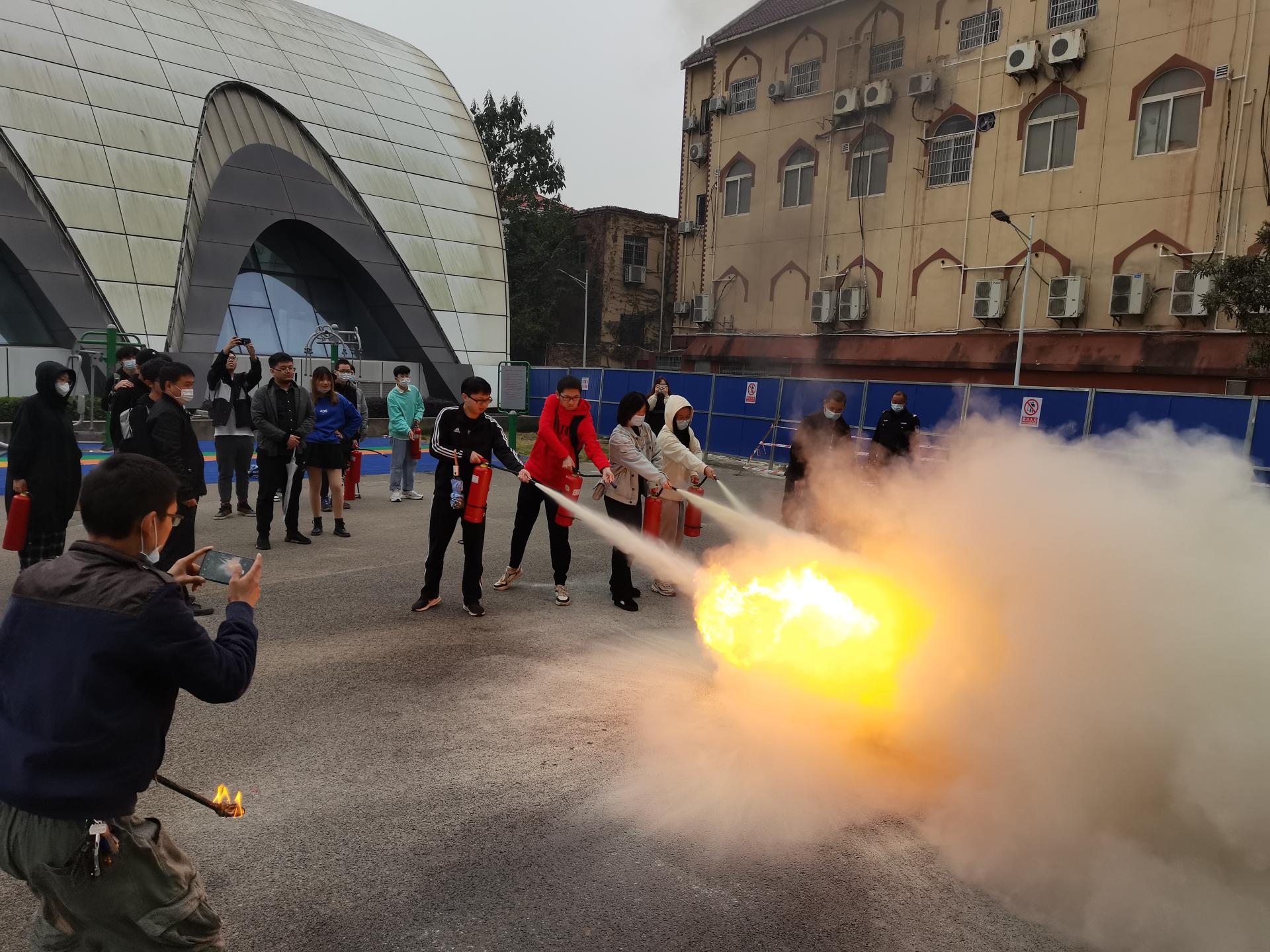 户外消防演习环节。刘老师为同学们介绍了公司常见的灭火器种类,教学了火灾现场应急处理办法、灭火器灭火原理和基本操作方法及注意事项,让同学们在校园中能正确运用相应的“武器”来对抗火灾。在讲解原理后,安全保卫部消防科的老师们带领全体在场师生参加室外消防演习活动,通过实践来巩固自身的消防意识和自救能力。