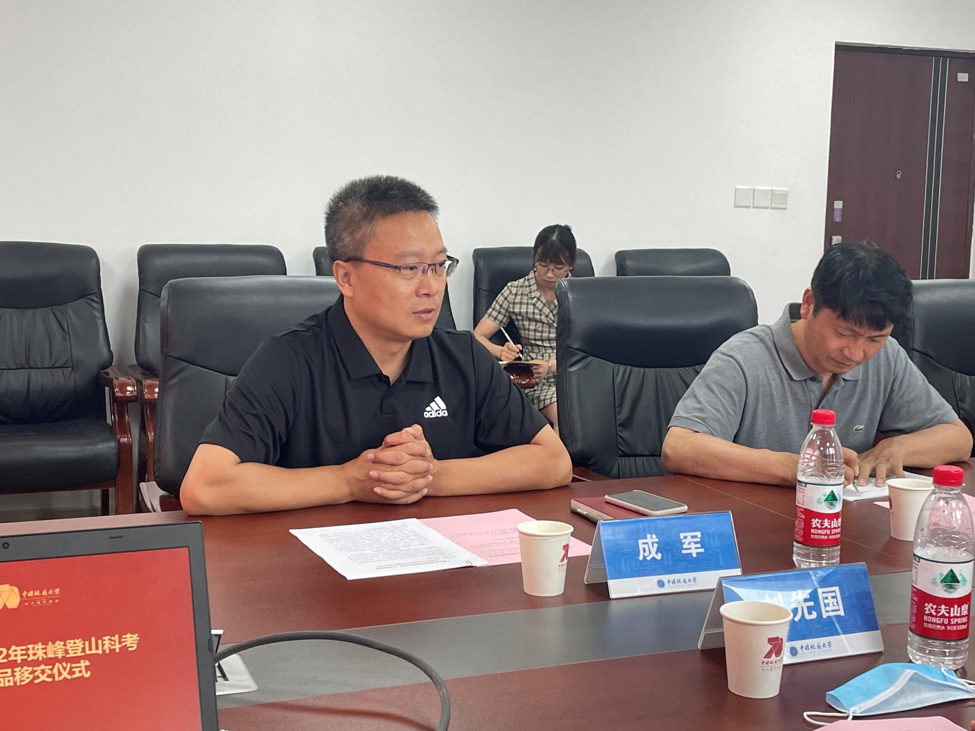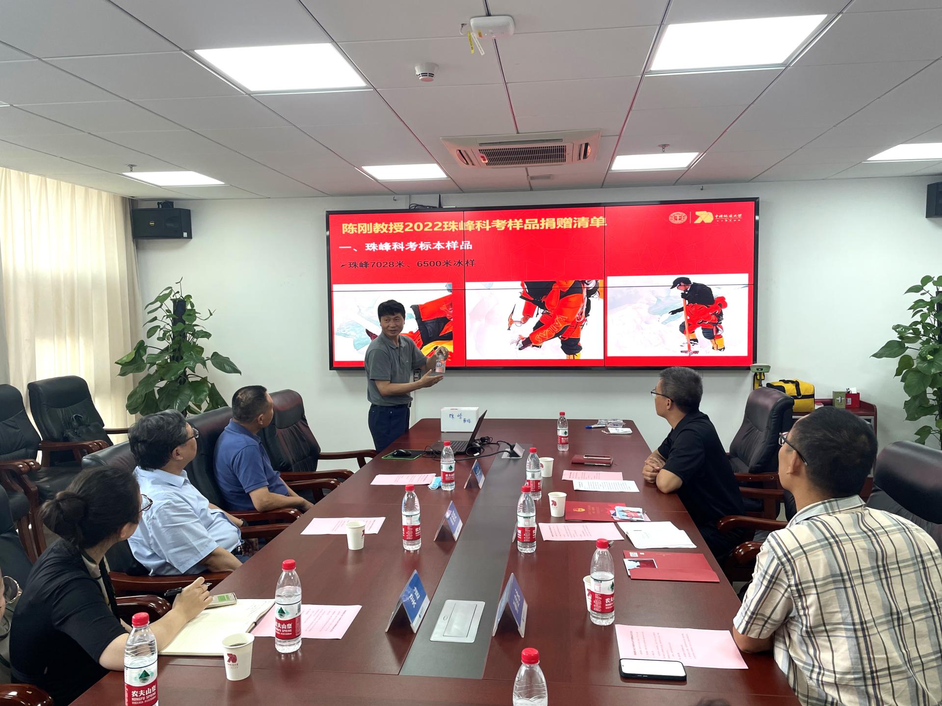 陈刚教授结合珠峰科考介绍捐赠物品清单。他讲到:“此次捐赠的物品共分为‘珠峰科考样本样品’、‘登顶珠峰纪念品’、‘登顶珠峰技术设备’三类,辅以大量图片、视频资料,系统的展示了2022年珠峰登山科考的历程,期望能让公司更多师生领略珠峰风景,感悟‘地大攀登精神’内涵。”