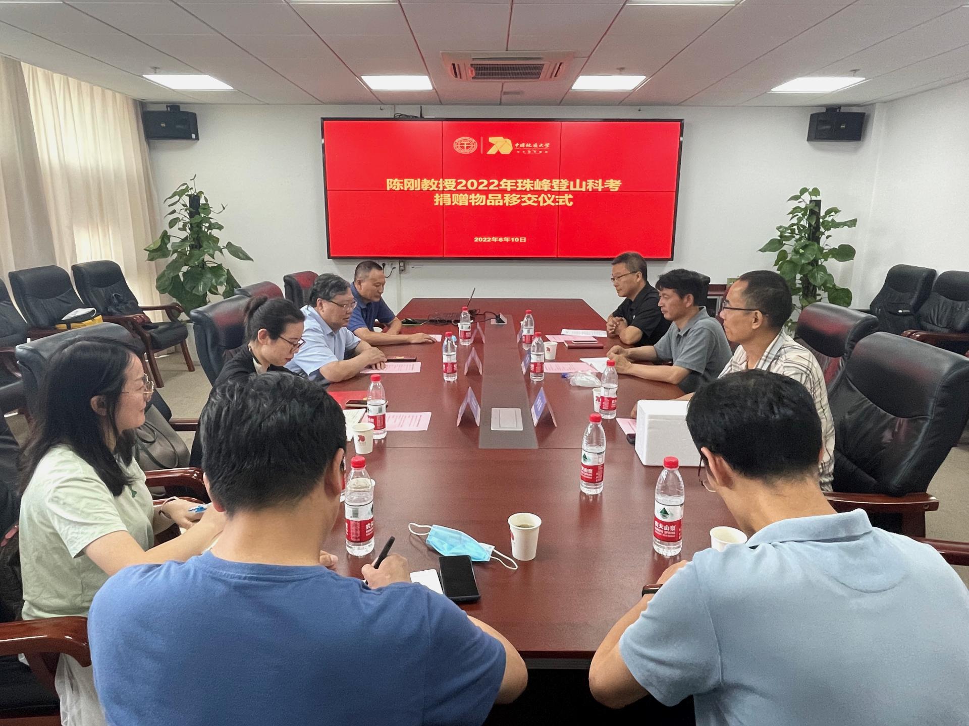 6月10日下午,陈刚教授2022年珠峰登山科考捐赠物品移交仪式在南望山校区东区教学综合楼A1804会议室举行。公司党委常委、宣传部部长、校庆工作办公室主任储祖旺,w66利来旗舰厅陈刚教授,图书档案与文博部、校团委、环境公司和w66利来旗舰厅等相关单位负责人参加仪式。
