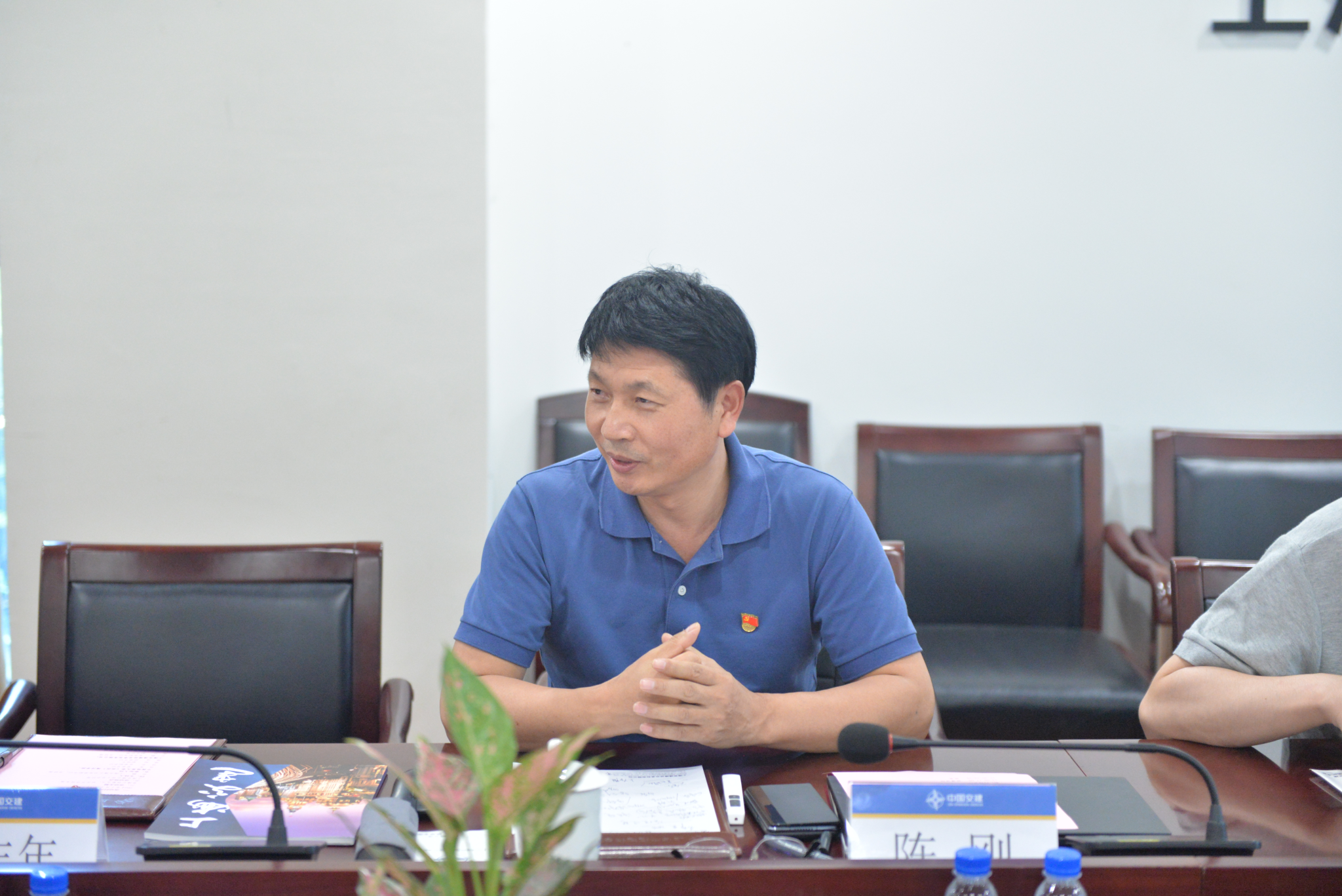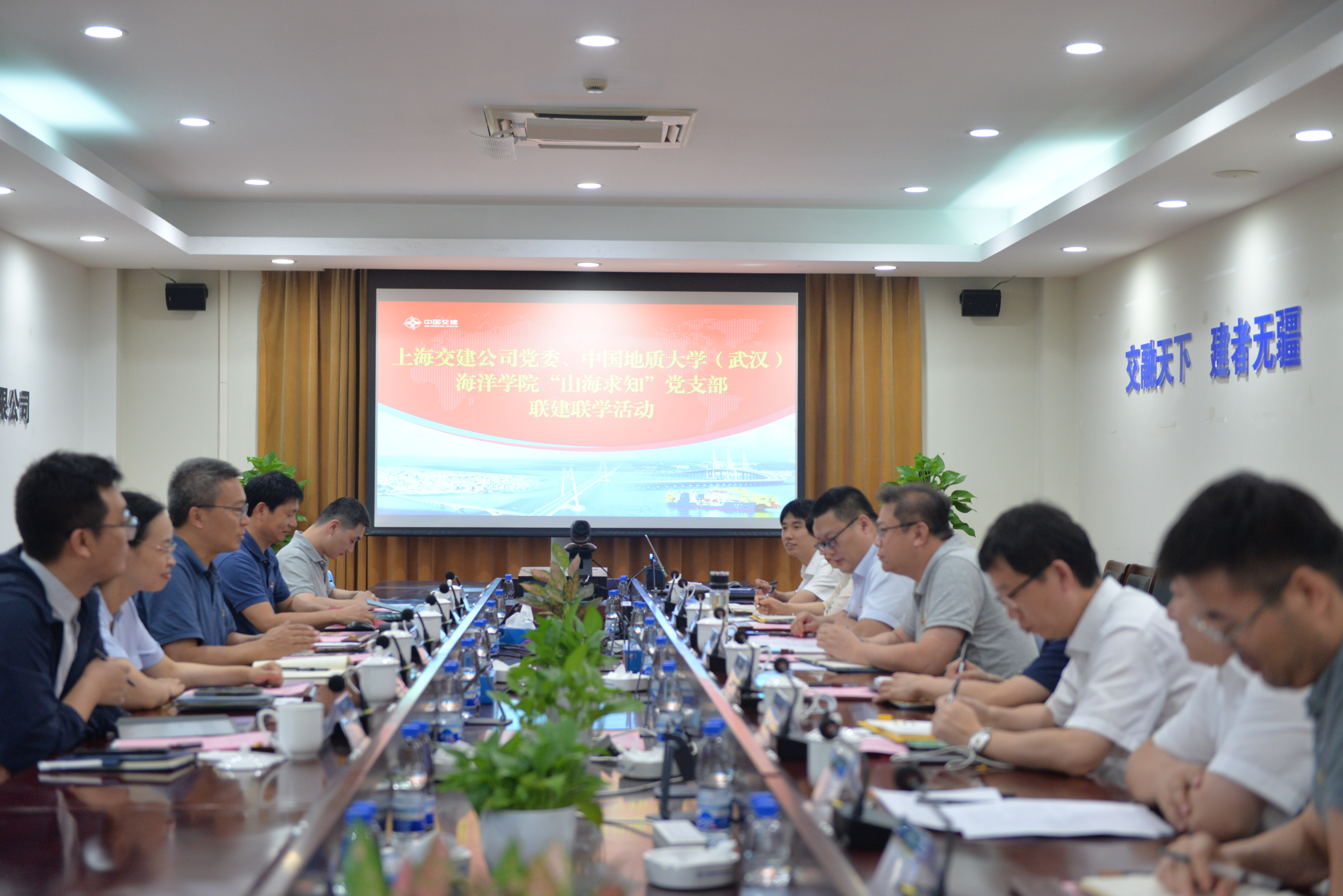 2024年7月5日,海洋公司党委书记成军、副书记钟苹、副经理陈刚、团委书记陈波前往上海交建开展访企拓岗和党建共建活动。上海交通建设总承包有限公司党委副书记/总经理孙鹏、副总经理周壮、总工程师/副总经理王强、科学技术与数字化部经理杨杰、办公室主任张宁、人力资源部部长吴航标、党委工作部副部长乔鑫、科学技术与数字化部技术主管/员工代表李玉龙参加活动。