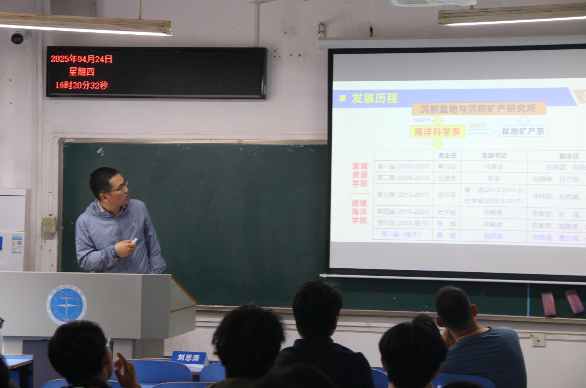 在海洋科学系会场,刘恩涛老师详细介绍了海洋科学系的历史积淀、学科布局及人才队伍建设。他系统梳理了海洋科学系在海洋底构造、海洋沉积、海洋化学与深时海洋、海洋地质灾害、海洋地质年代学等核心研究方向的发展脉络、教学资源优势和员工升学就业去向。近年来,海科系毕业生升学率稳定在69%以上,其中2019届升学率高达77%,四分之一员工进入中国科公司深造,另有四分之一员工被“985”高校录取。