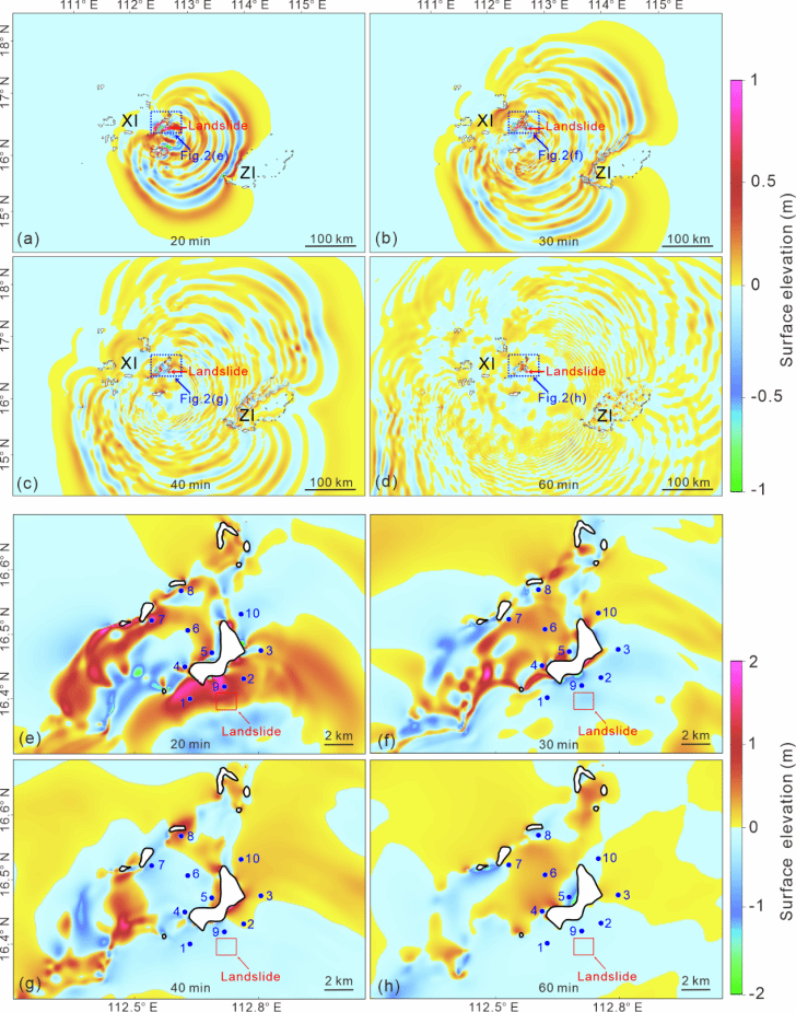 通过小波变换和模态分解方法,研究团队重点分析了海啸传播过程中的能量变化与波浪相互作用,并探讨了岛礁共振对海啸波高的影响。研究发现,滑坡激发的海啸可在岛礁之间引发波浪共振,导致海啸影响持续时间显著延长。