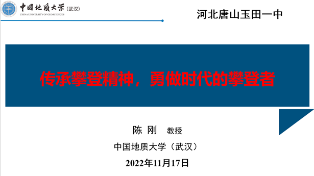 (通讯员:钟彦晶 陈波)传承攀登精神,勇做时代的攀登者。11月17日晚,“山海求知”研究生党支部以线上直播的形式走进河北玉田一中专题宣传地大七十年校庆,宣扬地大攀登精神。党支部书记陈刚教授、党支部宣传委员王江源同志为玉田一中50余名师生作报告。活动由党建辅导员陈波老师主持。