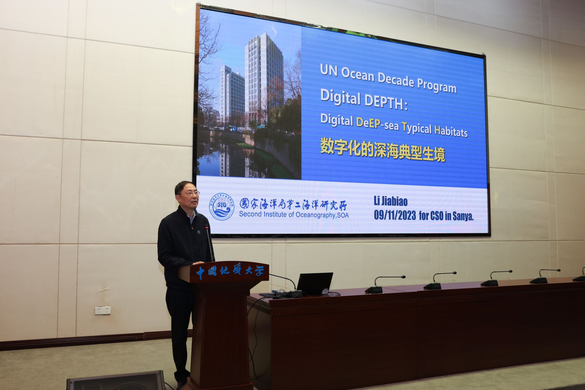 仪式结束后,李家彪为师生作题为《数字化的深海典型生境》的专题学术报告。他在报告中深入讲解了海山、洋中脊、陆坡和海底平原等易受自然变化、气候变化、人类活动影响的深海典型生境类型,以及集成深海典型生境“一张图”等公共产品并形成深海典型生境治理解决方案。