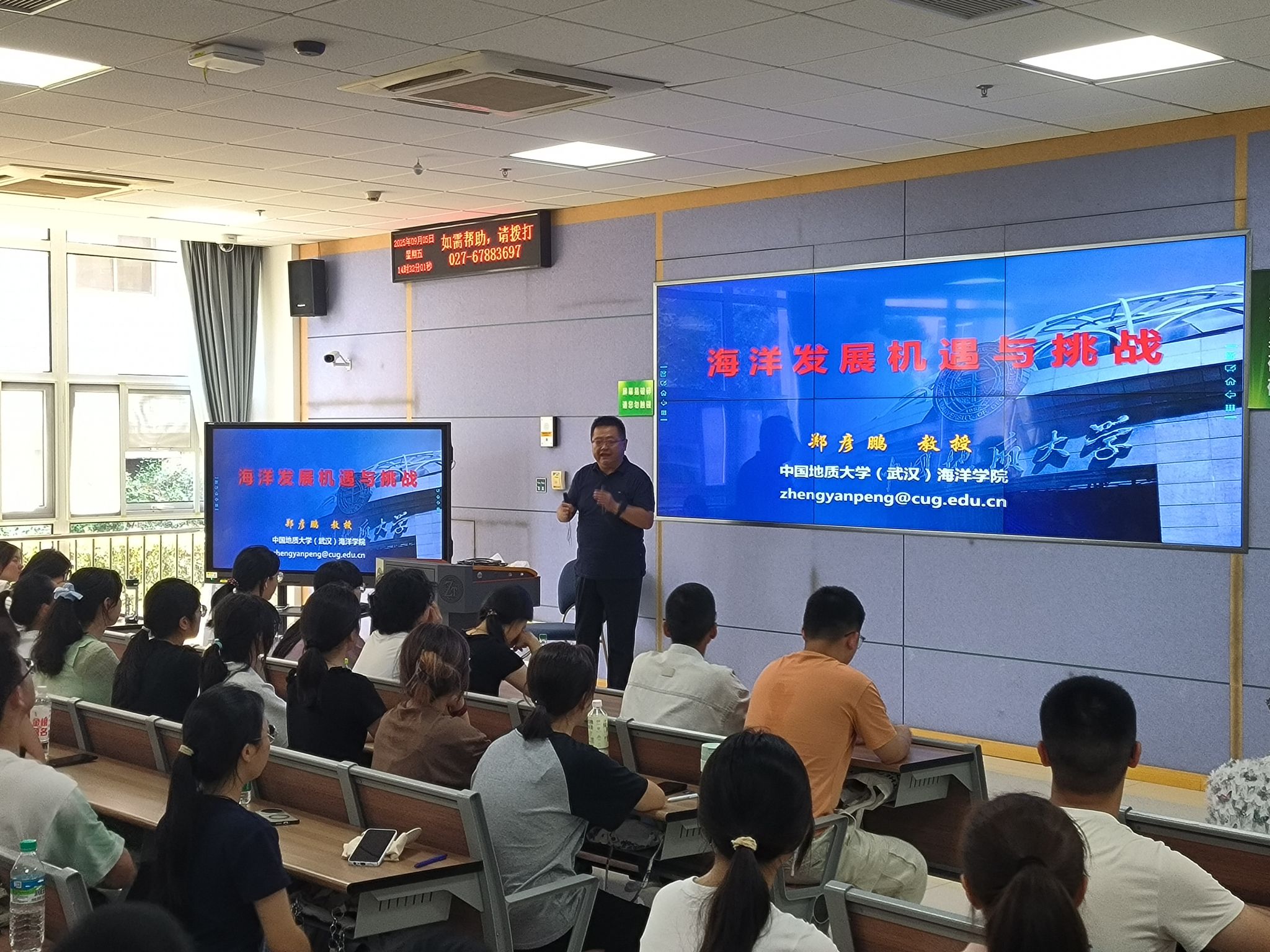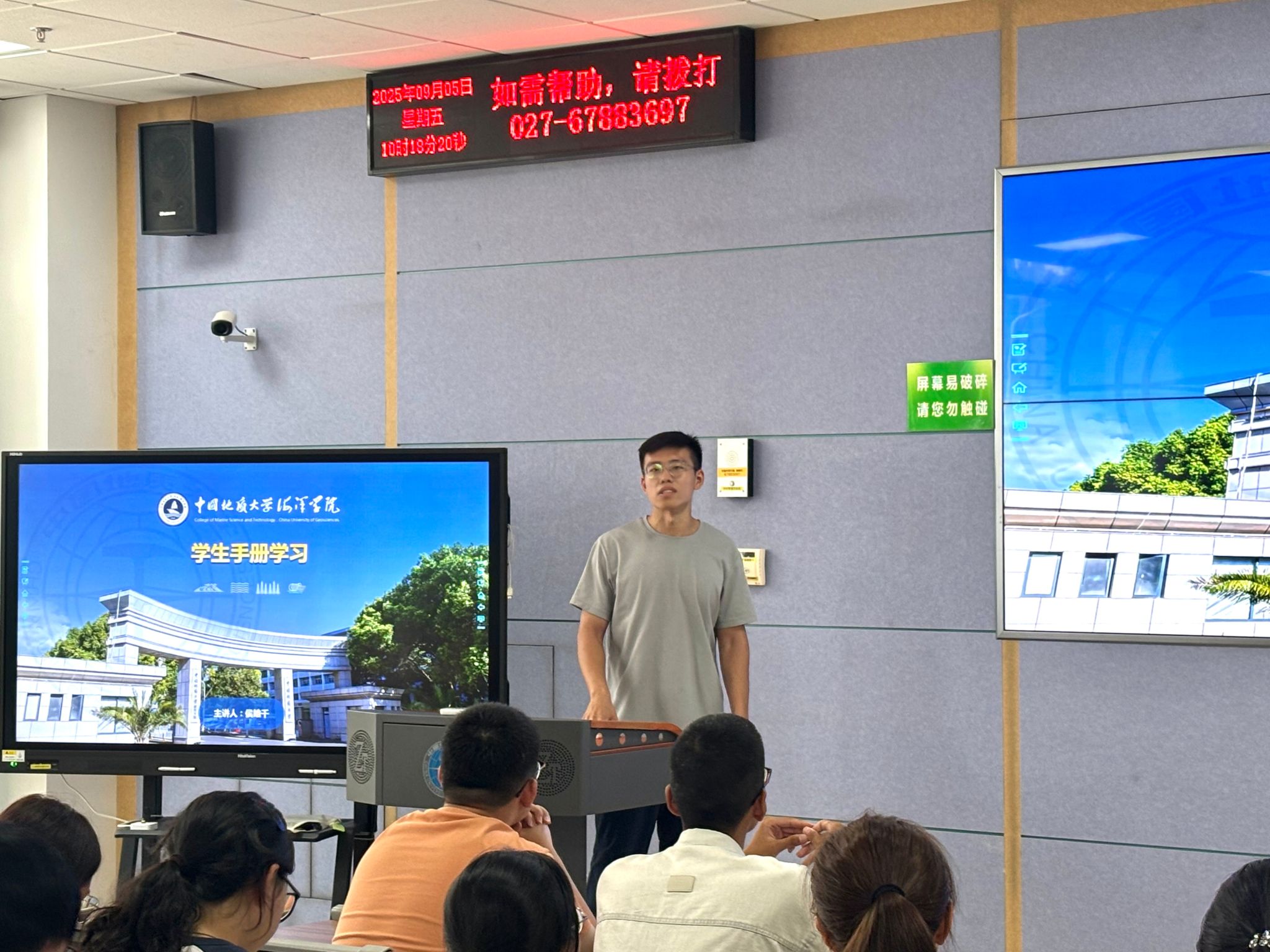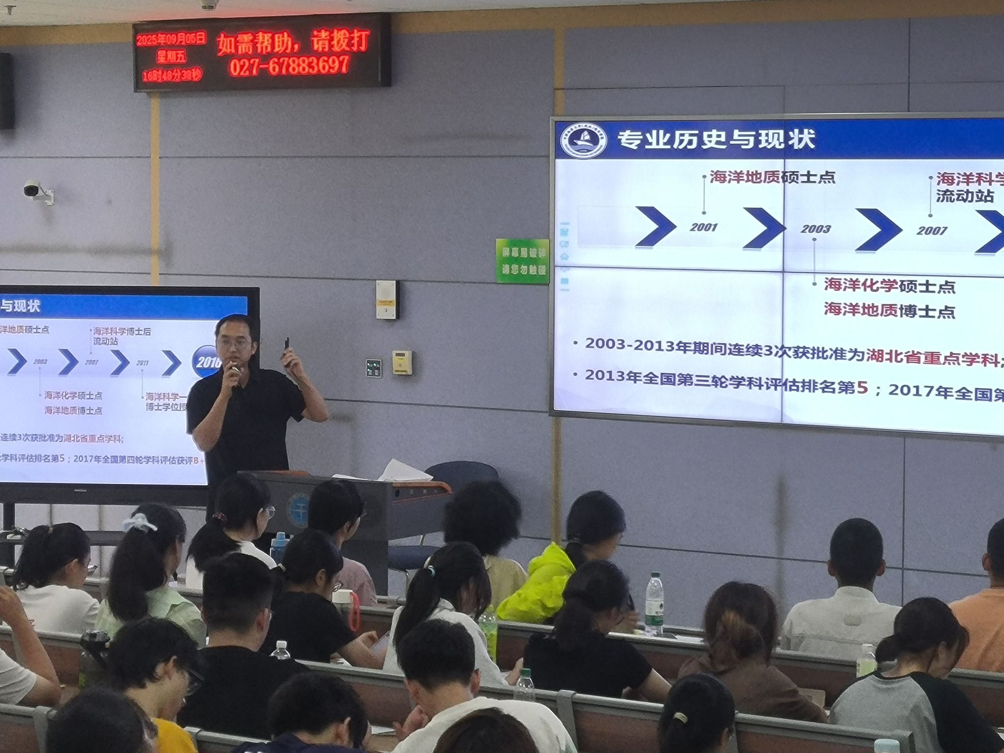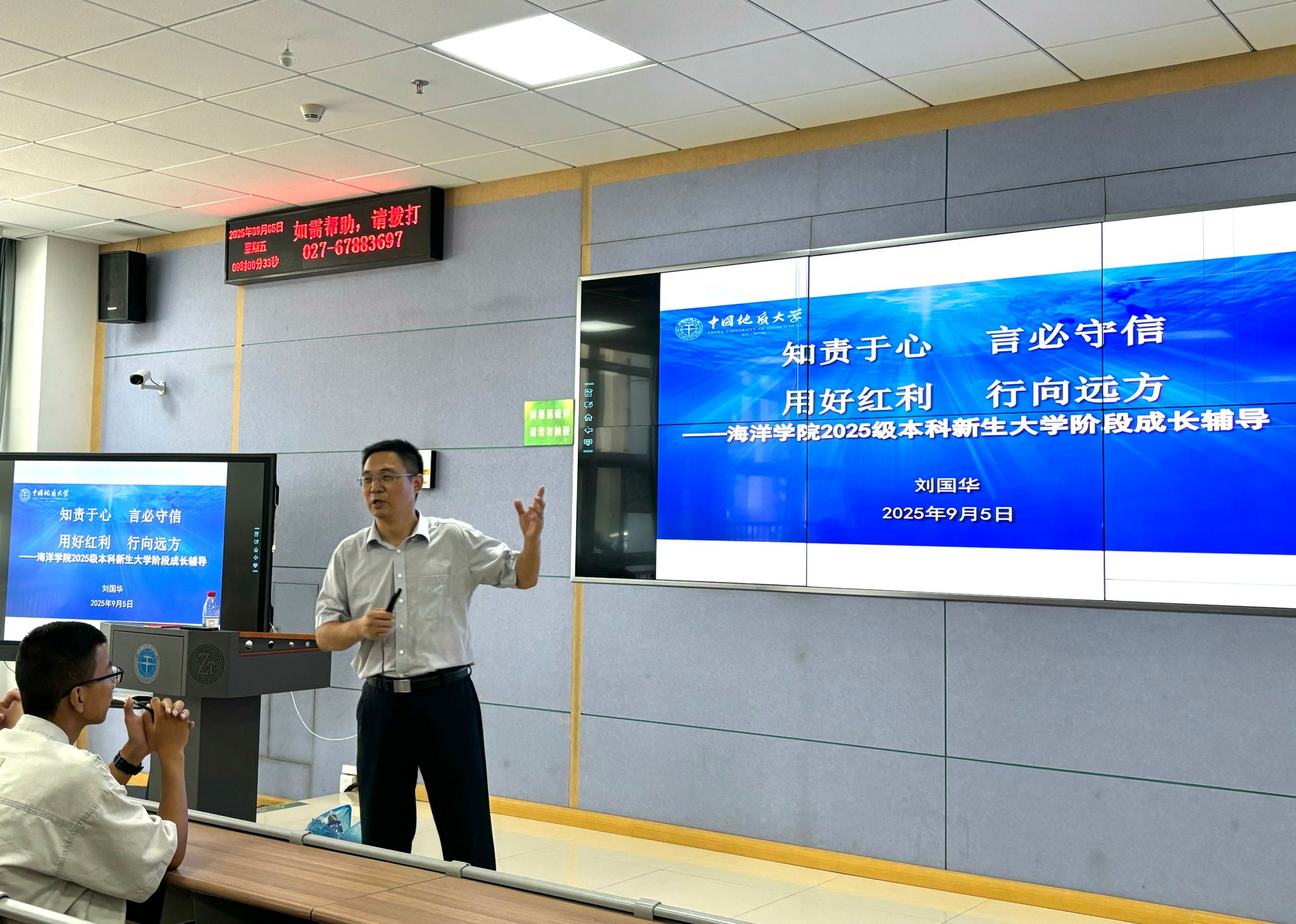 公司党委书记刘国华以《知责于心  言必守信  用好红利  行向远方》为题,提出他对新海洋学子在地大学习成长的期待,播放了纪念中国人民抗日战争暨世界反法西斯战争胜利80周年文艺晚会中的情境剧《永远的番号》、《勘探队员之歌》《周口店的那个夏天》《方向》等视频,带领同学们了解w66利来旗舰厅的发展历程、学科专业与人才培养、科学研究与科研条件、重点研发团队、五大实习站点、升学和就业等内容并围绕党史、校史、院史、抗战精神等开展现场抢答活动。
