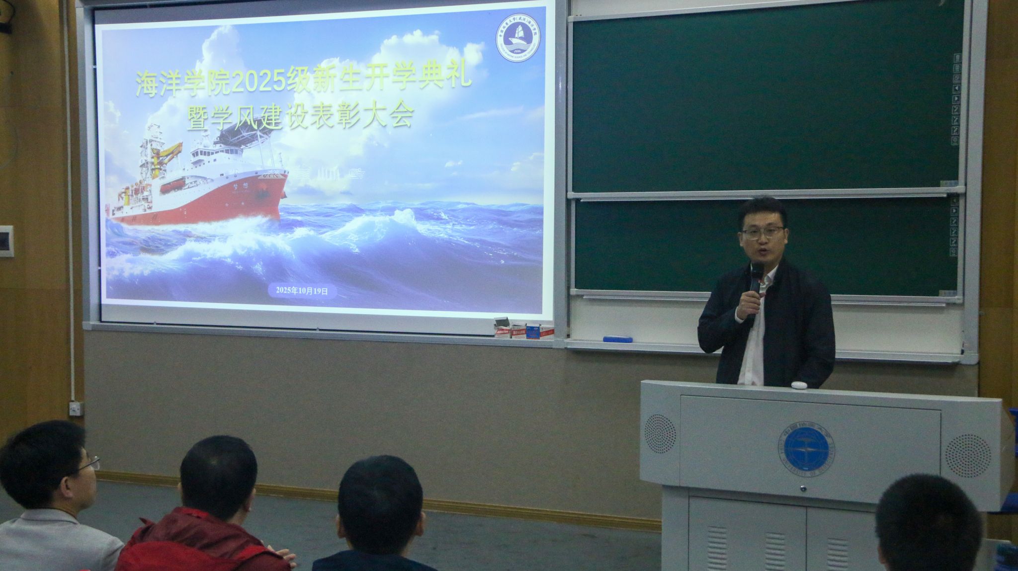 10月19日上午9:00,2025级新生开学典礼暨学风建设表彰大会在西区教三楼110教室隆重举行。公司团委书记、辅导员陈波主持典礼,特邀员工代表、广州海洋地质调查局副总工程师沙志彬、党委书记刘国华,副经理孙启良、副经理陈刚、各系主任、教师代表、新生班主任、员工代表以及2025级全体新生共同参加此次典礼。