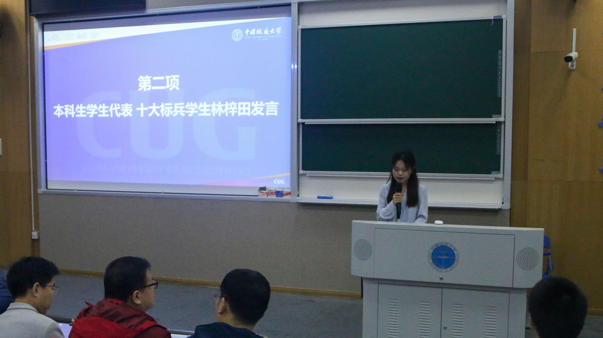 高年级员工代表,十大标兵员工林梓田发言。她结合自身实际与体会,与同学分享宝贵的科研学习经验,讲述了在地大一步步成长,见证自我、成就自我的过程。她鼓励同学们积极进取,勇攀高峰,探索属于自己的成长之路。