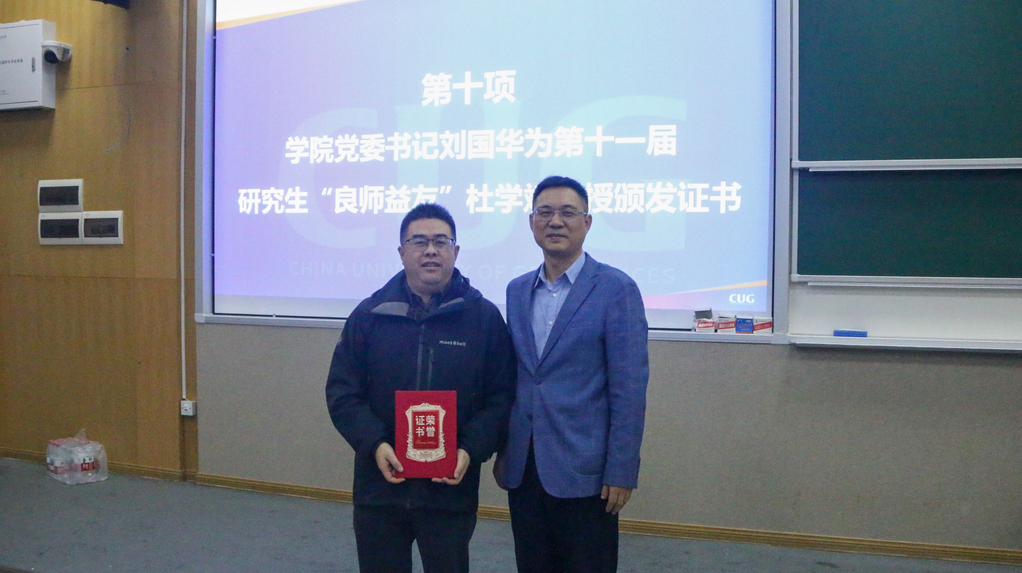 公司党委书记刘国华为第十一届研究生良师益友杜学斌教授颁发证书。