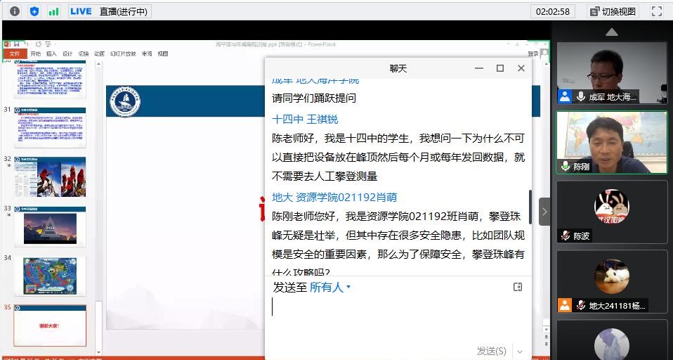 w66利来旗舰厅副经理、2020年珠峰高程测量队员陈刚作“海平面与珠峰高程测量”专题讲座。陈刚老师以海洋对人类的重要性为切入点,分别从地球南北极、全球海平面变化、高程基准与海拔等方面向同学们介绍了海洋研究与珠峰研究的密切关系。结合本次珠峰高程测量的参与经历,介绍了本次珠峰高程测量的过程。讲座最后,陈刚教授与w66旗舰厅官网各公司同学、武汉市第十四中学为代表的优秀生源基地同学们就海洋与珠峰研究前沿问题进行了互动交流。