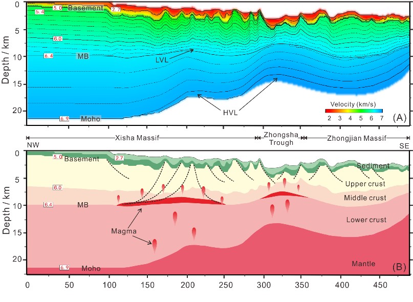 西沙隆起是南海西北陆缘的微板块之一,地壳厚度约20km,本研究利用二维多道地震数据,在西沙地块东南部识别出20个5.5 Ma以来的火山及其下部的岩浆运移通道。这些通道均发育自半地堑底部,而这些半地嵌由一系列ENE-WSW向或E-W向的拆离断层控制,这些拆离断层可能与岩浆通道存在密切联系。此外,海底地震仪(OBS)数据显示,这些拆离断层延伸至中地壳;同时研究区内存在下地壳高速异常(HVL)和中地壳低剪切波速层(LVL),这表明西沙隆起之下存在岩浆底侵和部分熔融,岩浆来源可能来自海南地幔柱。